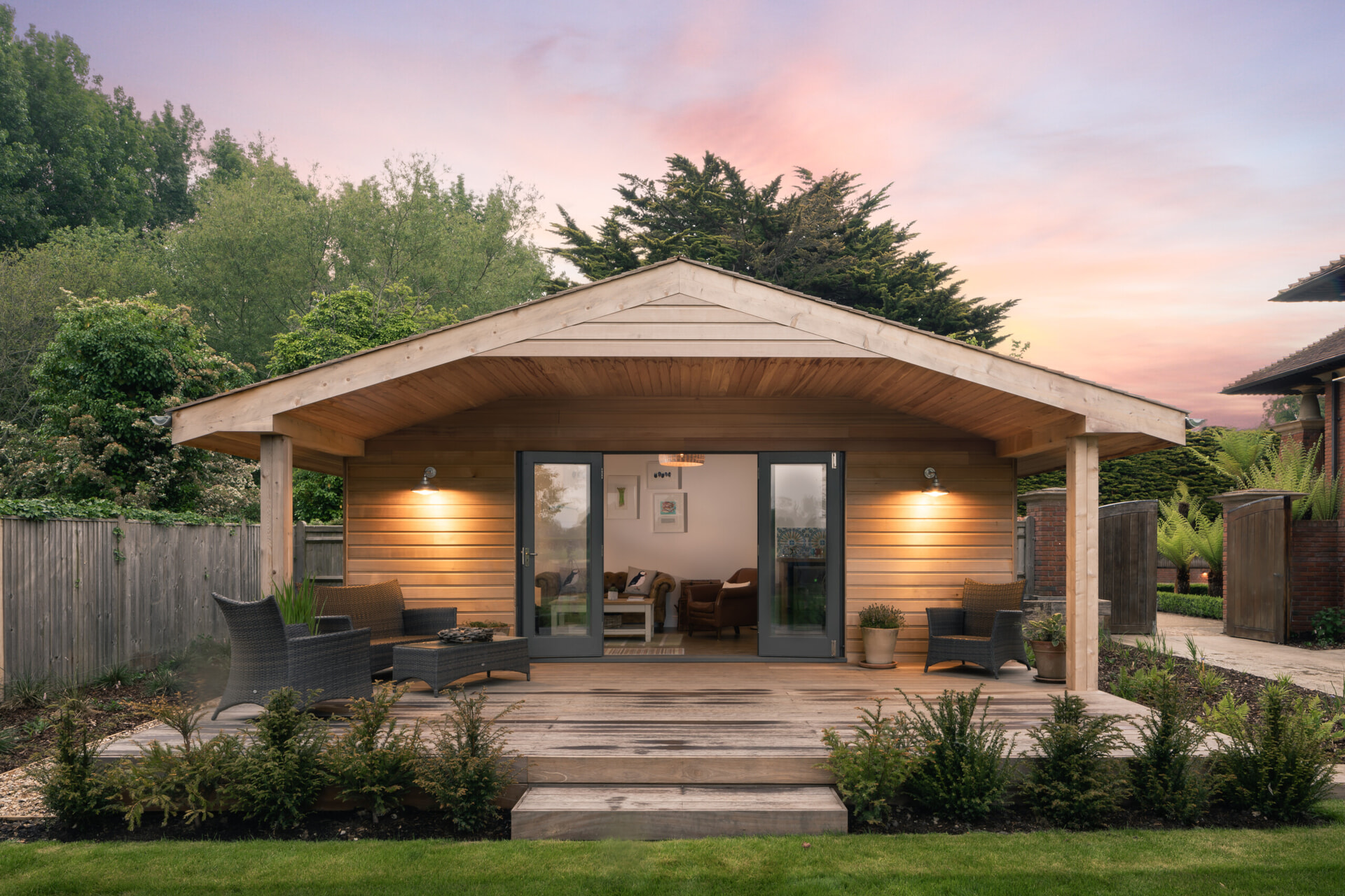 The front approach is dotted with statuesque tree ferns, cloud-pruned evergreens, delicate Acers and poached trees, all complementing the exotic shape of the roofline.