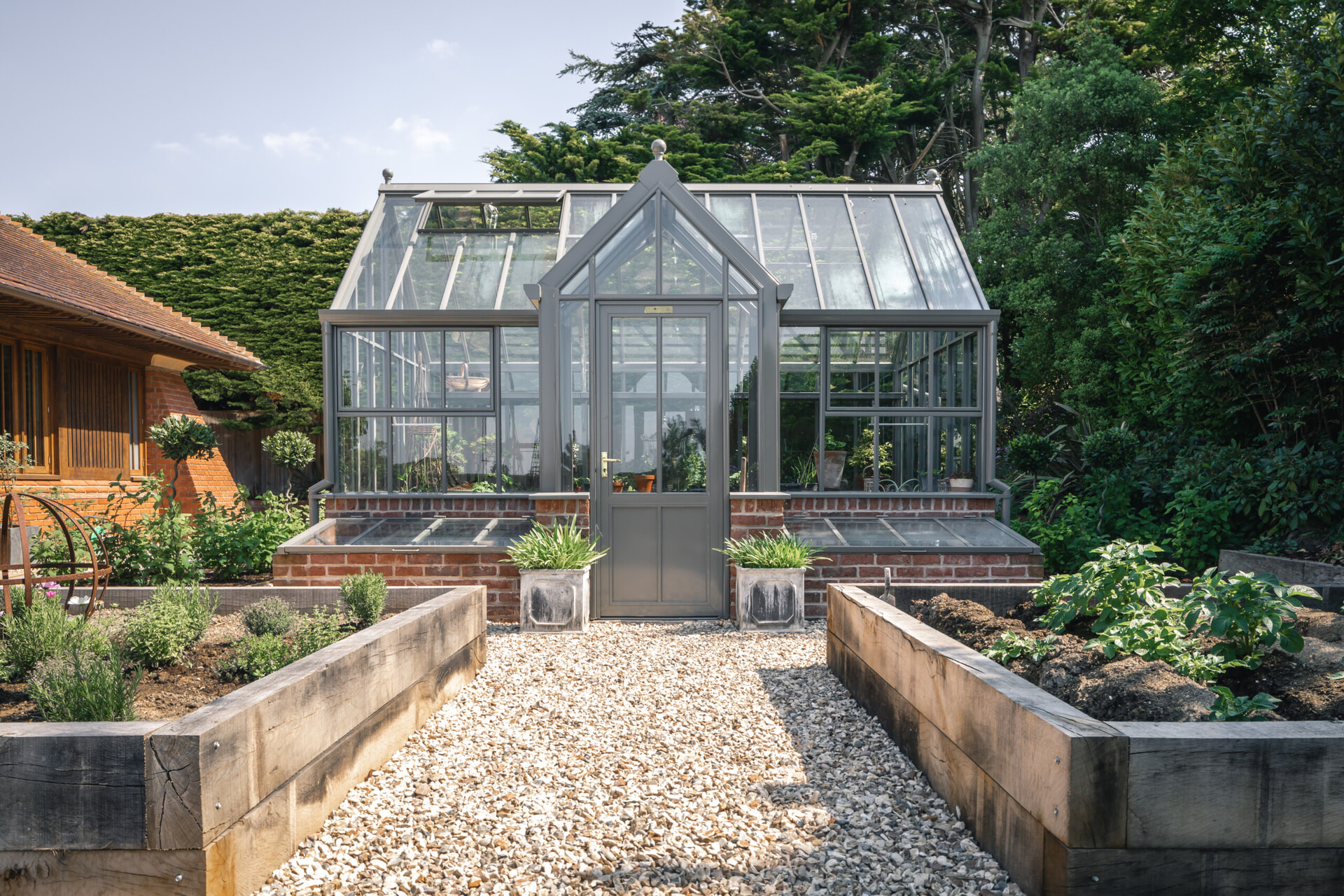To lend structure and autumnal interest we punctuated the beds with stunning multi-stem Persian ironwood trees, and softened shared boundaries with a freshly-planted wildflower meadow. Vibrant and reflective water bowls crown the large brick pillars flanking the rear of the house, with sculptures fashioned by world-famous artist Phillip Jackson providing more highlights around the property. Despite the obvious theme of the garden, the client was keen to give it an English twist, so a traditional kitchen garden and glasshouse from Hartley Botanic was installed ready for the client to grow fruit and veg. These photos were taken shortly after completion and on one of the hottest days on record (!), we look forward to revisiting this project to see how its developed over the years.
