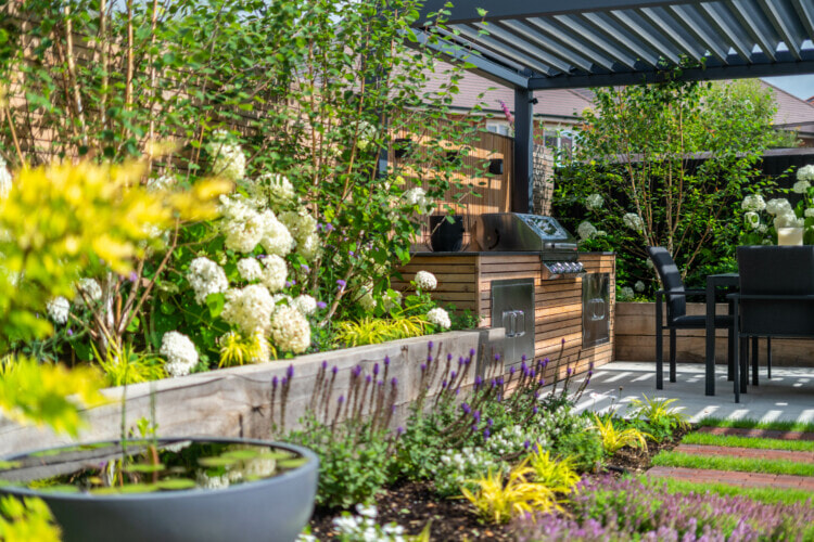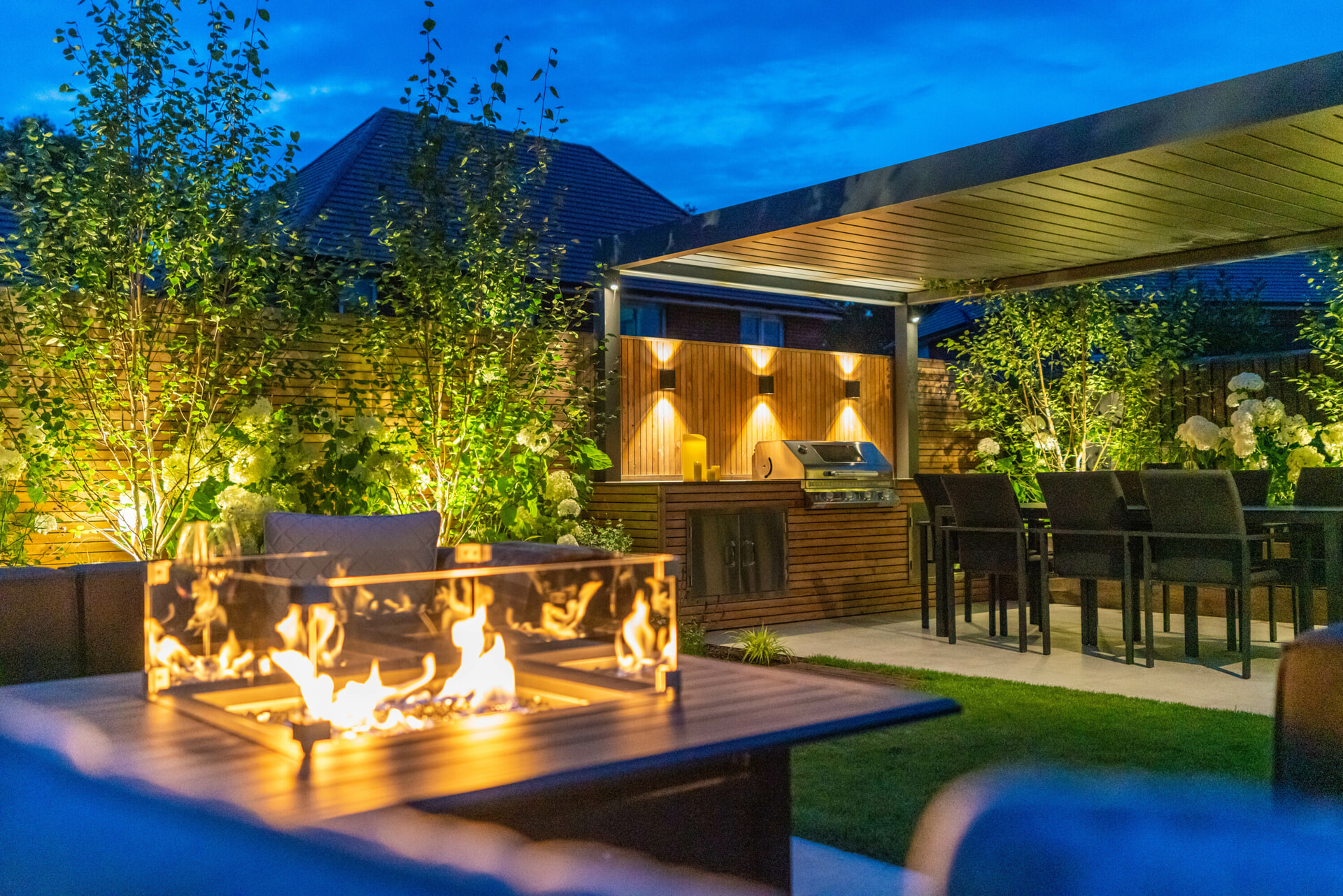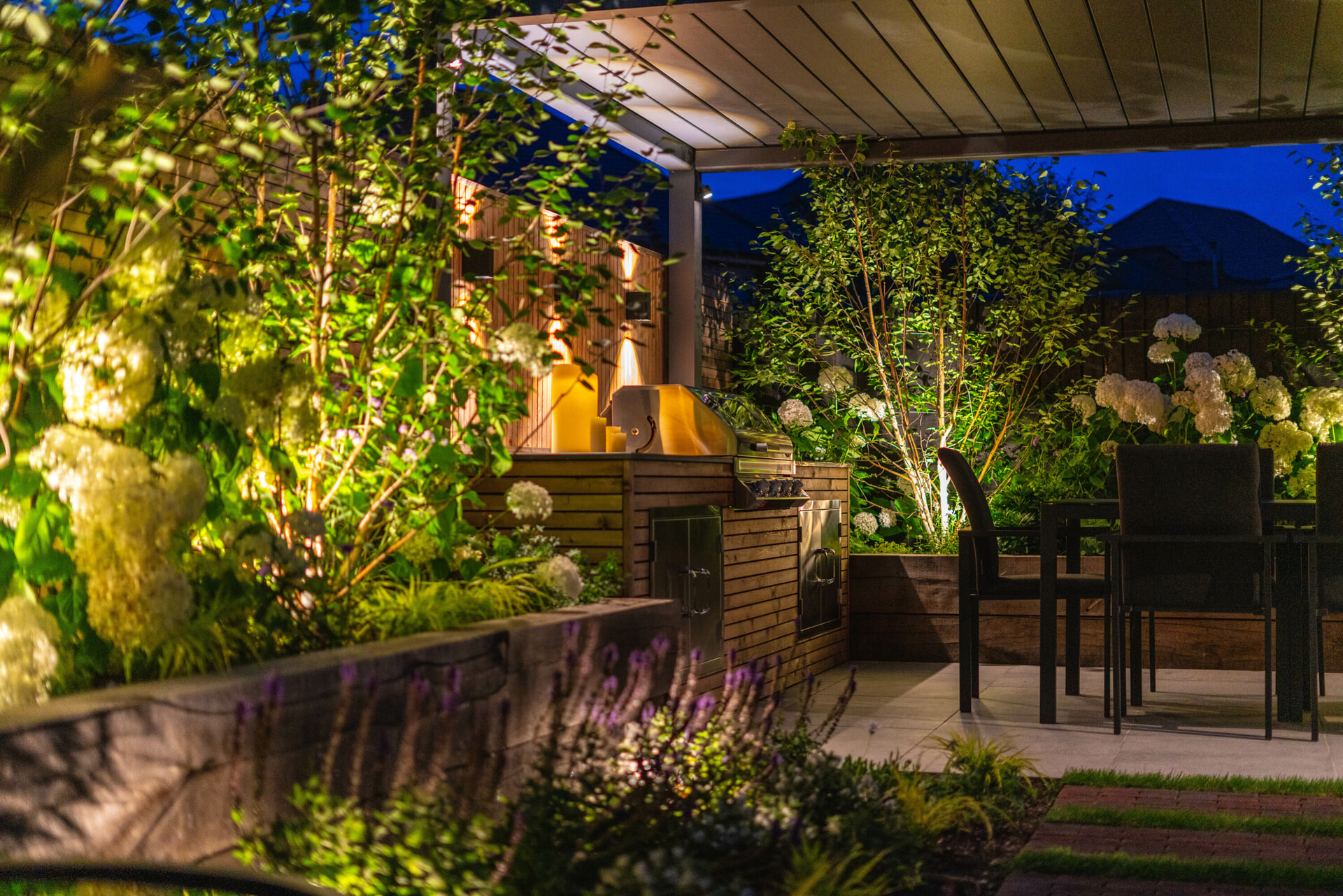 An extensive lighting system was designed and fitted to highlight certain focal points and features whilst extending use of the garden into the evening, no matter the season.